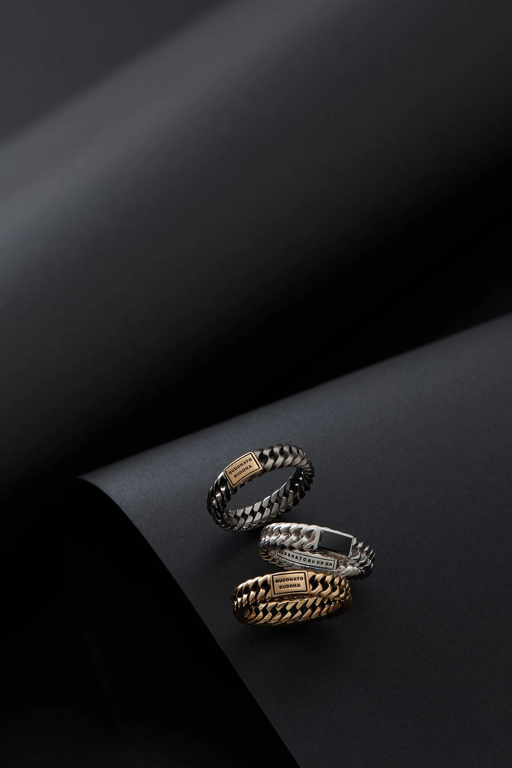 Three metallic rings with engraved text, placed on a black curved surface. The rings are black, silver, and gold, with a textured, braided design. View fullsize