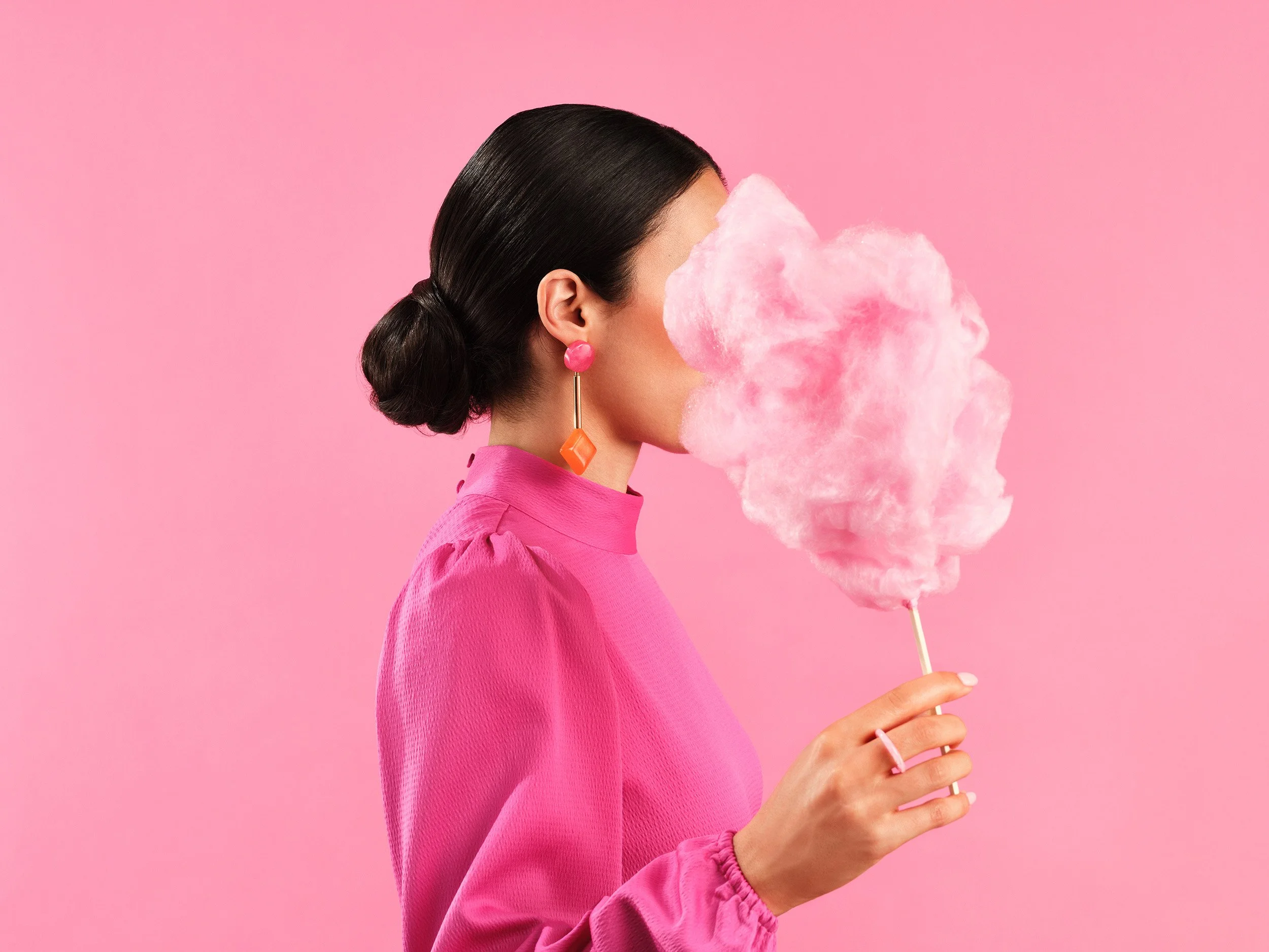 A woman dressed in pink holding a stick of pink cotton candy in front of a pink background. View fullsize