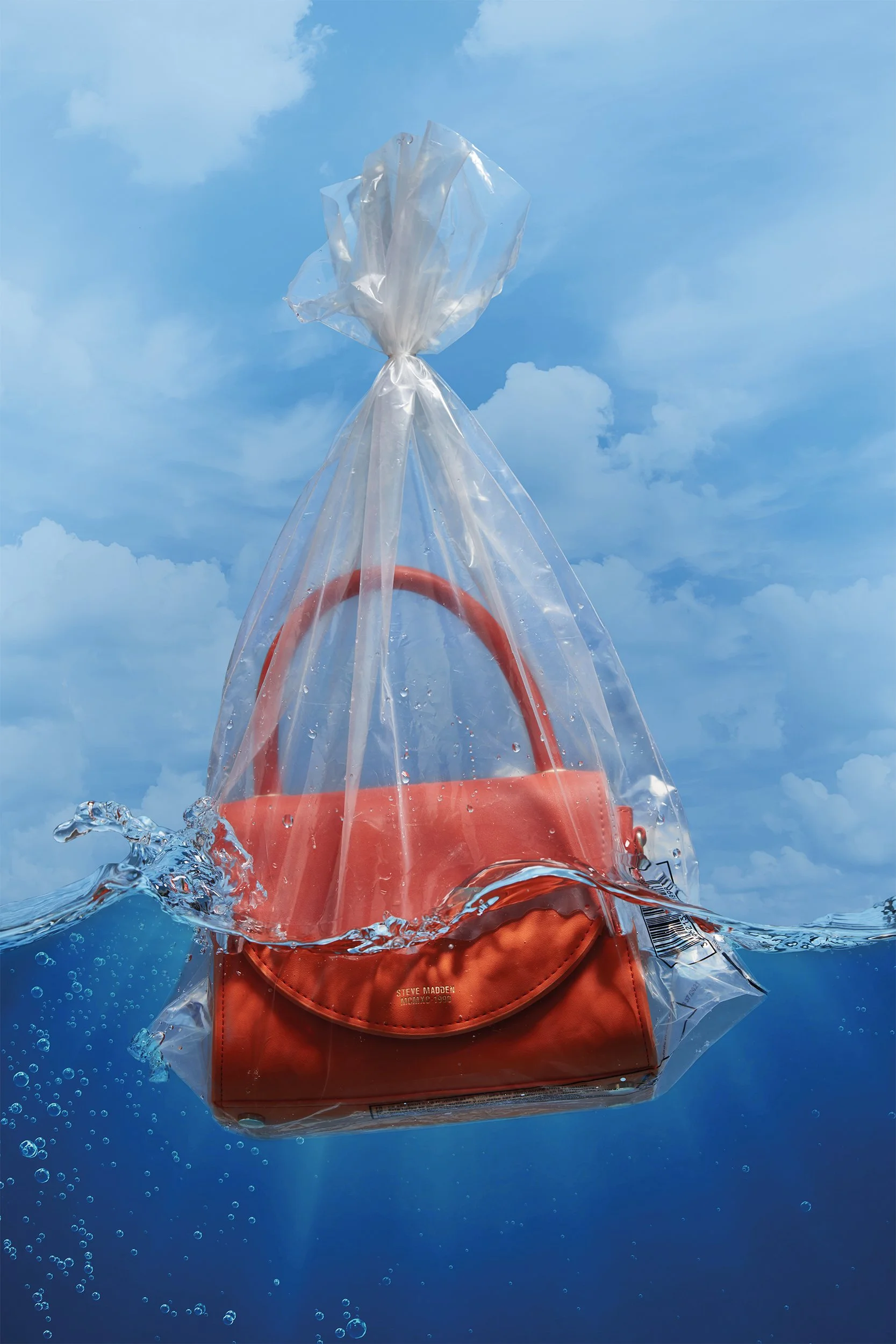 An orange handbag inside a clear plastic bag floating in water against a blue sky with clouds. View fullsize