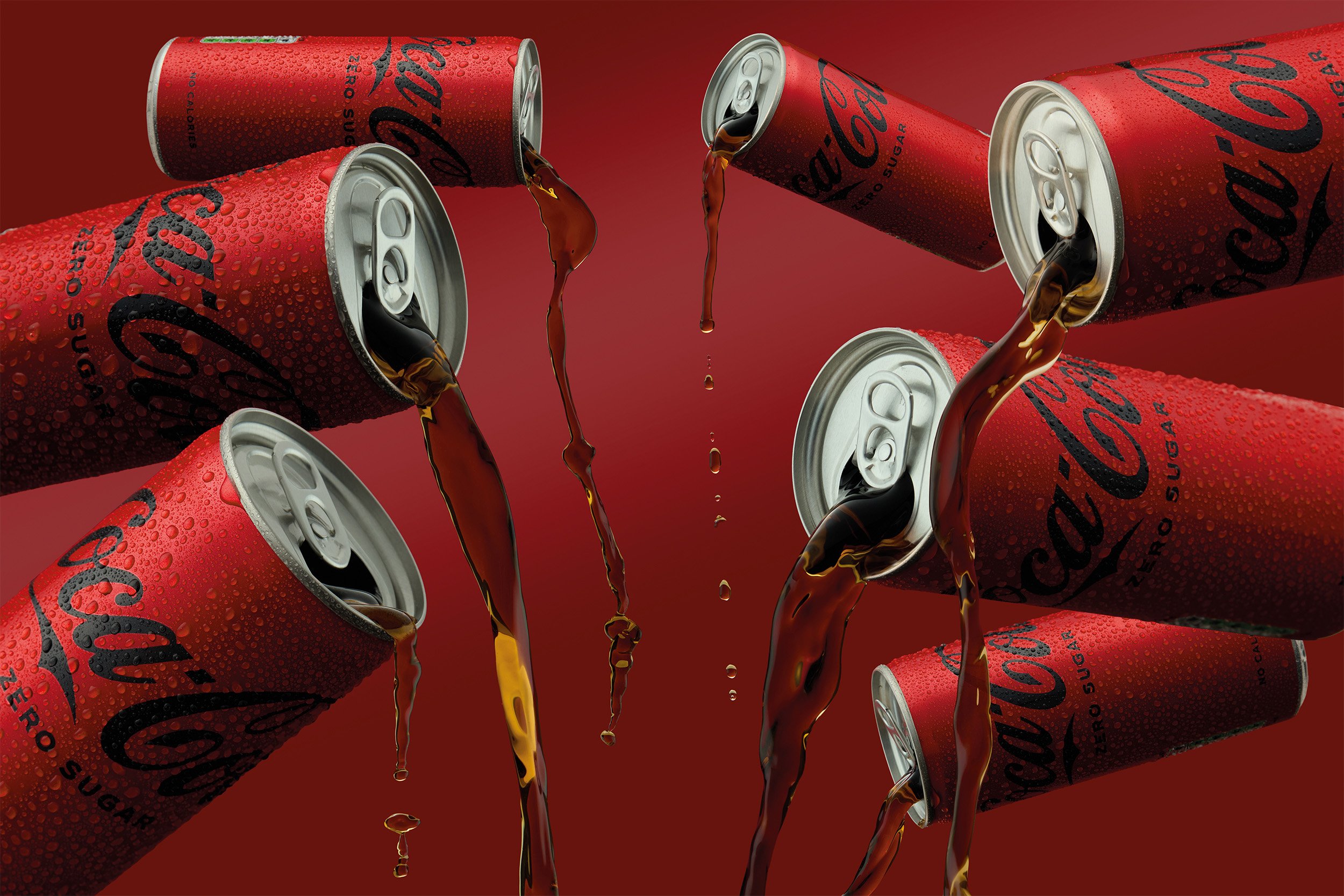 Multiple cans of Coca-Cola Zero Sugar pouring with soda on a red background. View fullsize