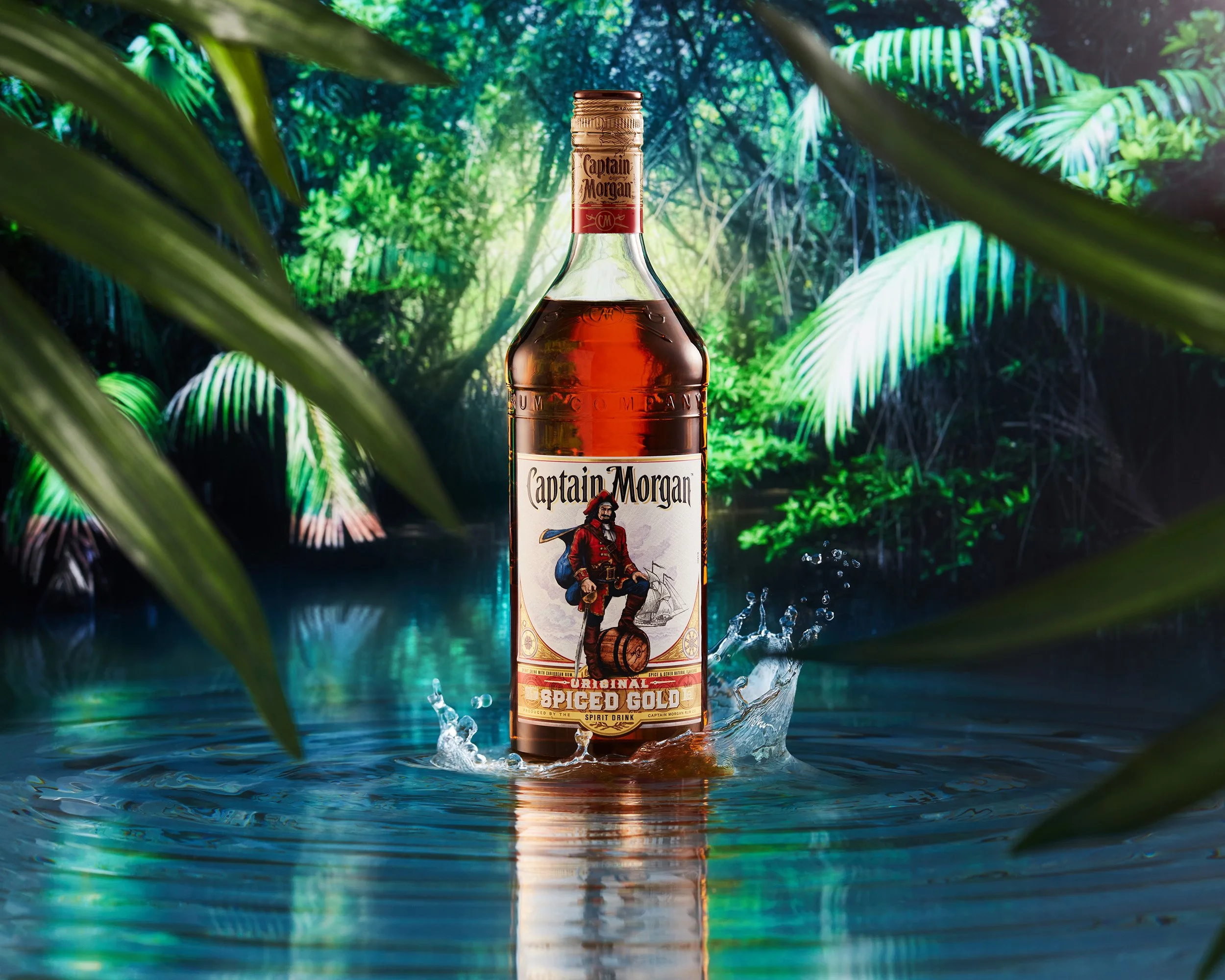 A bottle of Captain Morgan Spiced Gold rum standing in water with splashes, surrounded by lush green tropical plants and leaves, with a bright and vibrant jungle background.