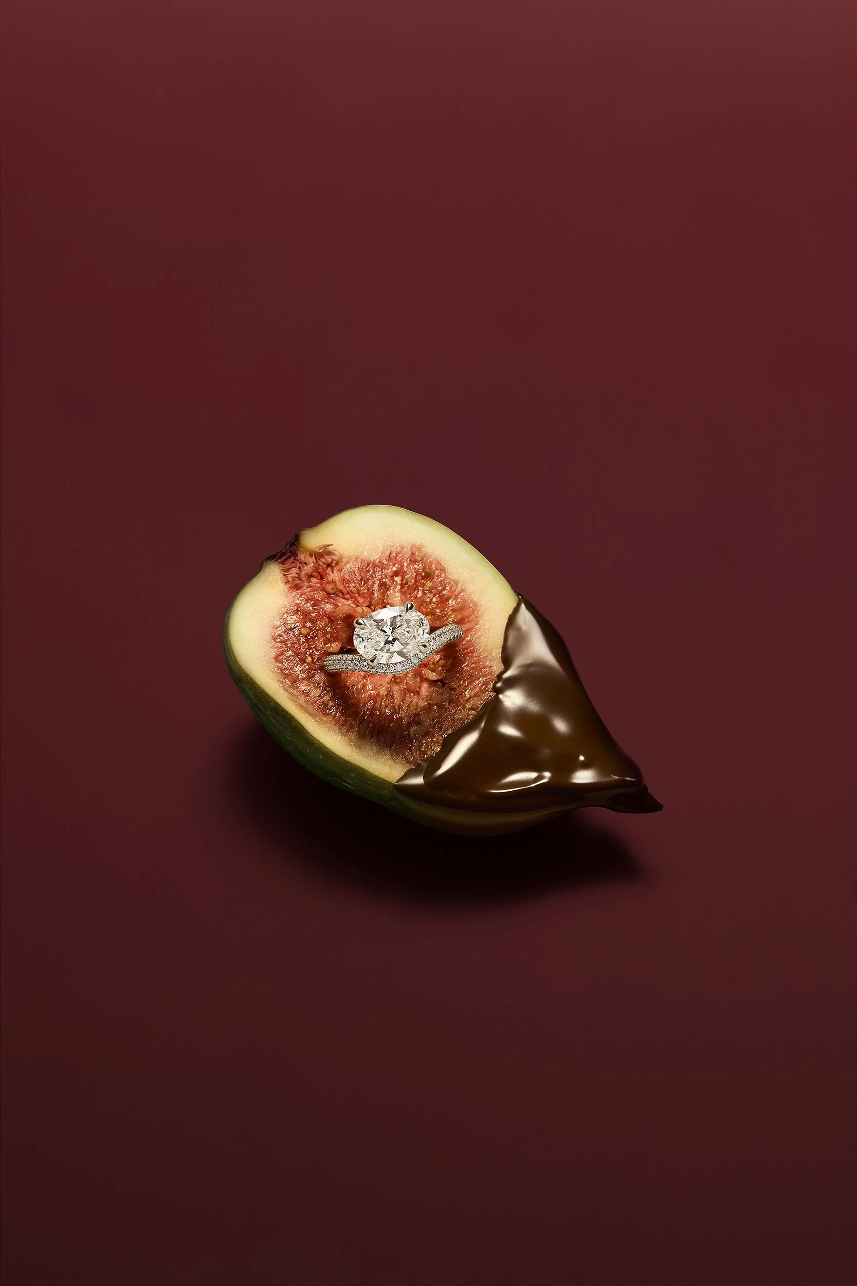 A halved fig with a diamond engagement ring on its seed, and the other half dipped in dark chocolate, placed on a dark red background. View fullsize