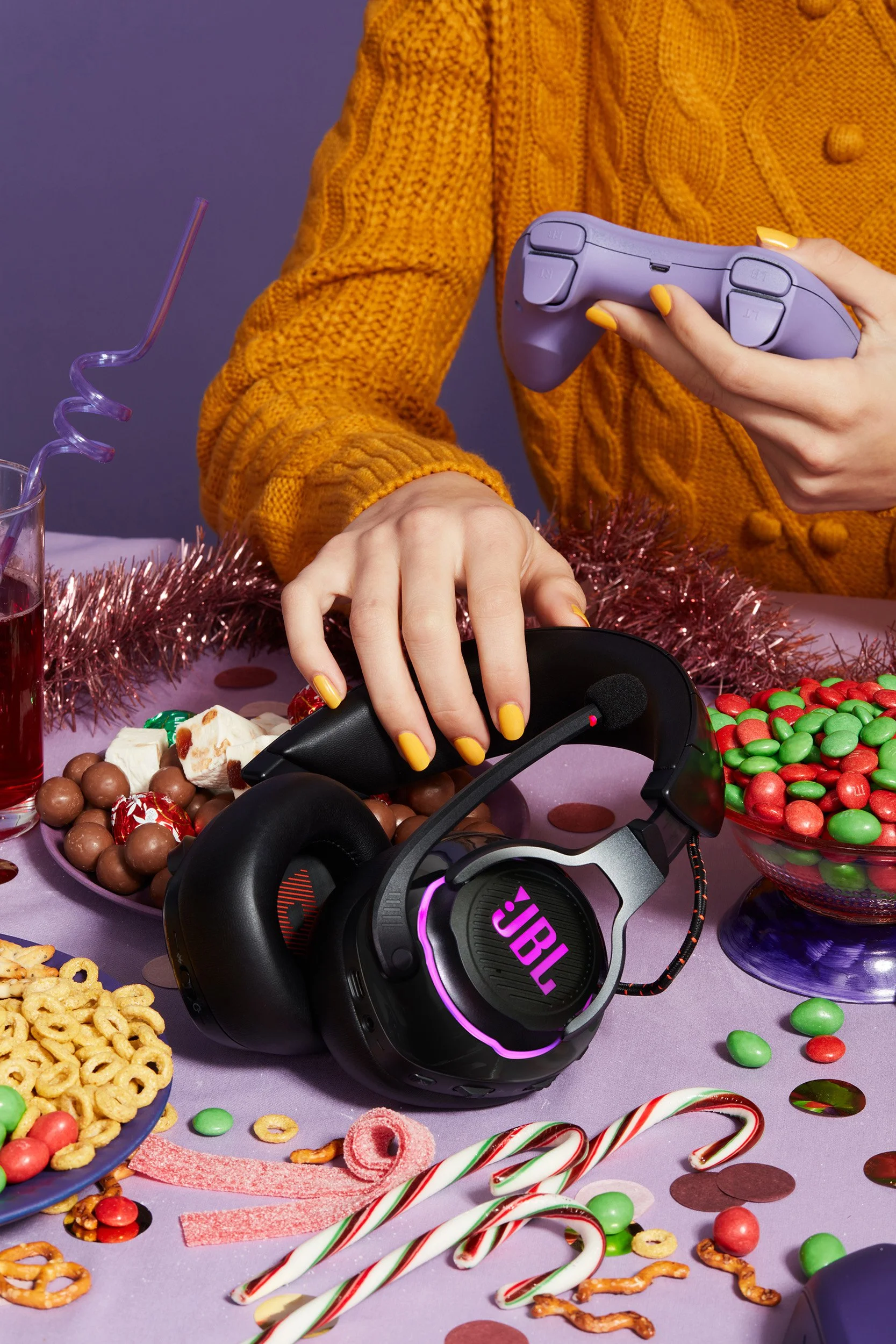 Person in a yellow sweater holding a purple gaming controller, surrounded by holiday treats, a pair of black JBL headphones, a bowl of colorful candy, and a glass of red drink on a light purple table